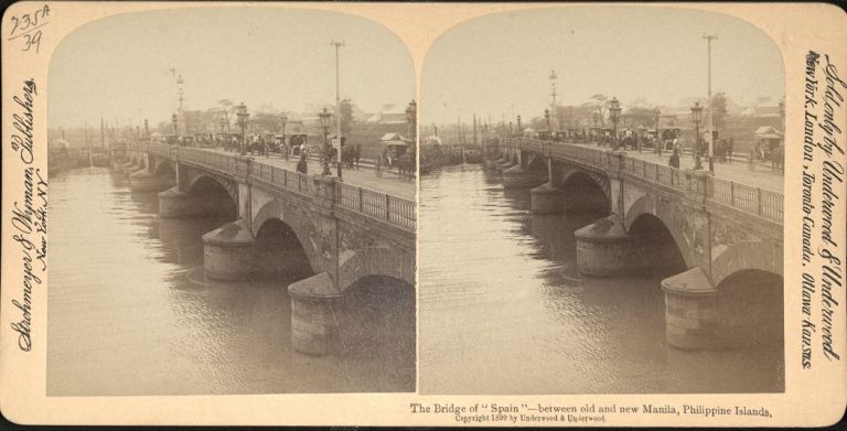 Underwood #U125. View of Bridge of Spain over Pasig River in Manila with pedestrians, calesas, and carts.