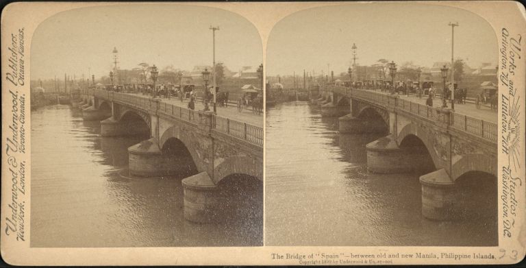 Underwood #U125. View of Bridge of Spain over Pasig River in Manila with pedestrians, calesas, and carts.