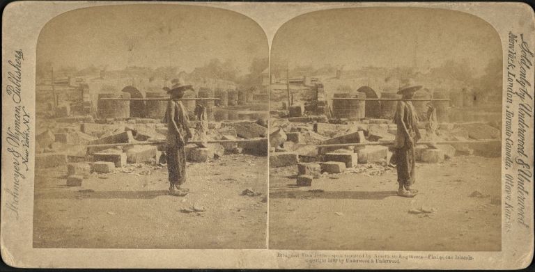 Underwood #U1195. Filipino carrying bamboo poles stands before partially-destroyed stone arch bridge in Tinajeros, Malabon, Philippines.