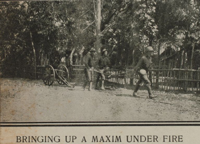Subject: U.S. soldiers with what appears to be a regular artillery cannon, not a Maxim. The Maxim gun, invented in 1883, was the first recoil-operated machine gun.