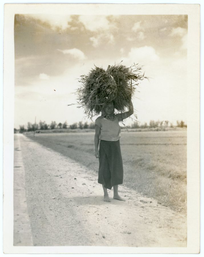 Filipino woman stands on a roadside in Pampanga, with a big sheaf of rice stalks on her head.