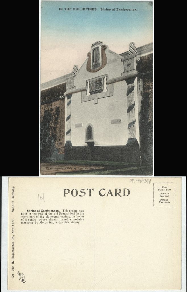 Shrine at Fort Pilar, Zamboanga City. Full caption: Shrine at Zamboanga: This shrine was built in the wall of the old Spanish fort in the early part of the eighteenth century, in honor of a sentry whose dream turned a probable massacre by Moros into a Spanish victory.