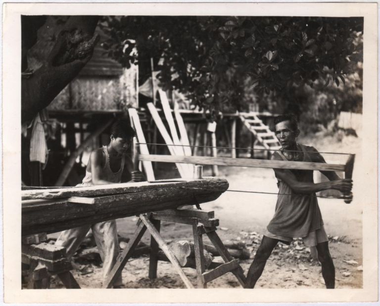 These men might be cabinetmakers (furniture makers) but at the moment they are sawyers. Filipino men use a two-person bucksaw to cut boards from a log. A bucksaw is a hand-powered frame saw.