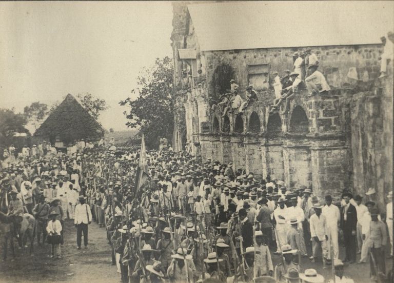 Subject: Filipino soldiers prepare to march out of Santa Cruz Church courtyard in surrender as crowds look on. General Cailles surrendered with 600 of his men and 386 rifles on June 24, 19