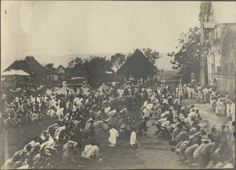 Subject: Filipino soldiers kneel at Santa Cruz Church courtyard during surrender ceremonies as crowds look on. General Cailles surrendered with 600 of his men and 386 rifles on June 24, 190