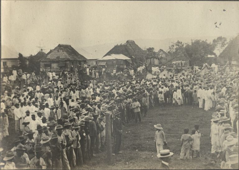 Subject: Filipino soldiers stand in formation at Santa Cruz Church courtyard to surrender as crowds look on. General Cailles surrendered with 600 of his men and 386 rifles on June 24, 1901