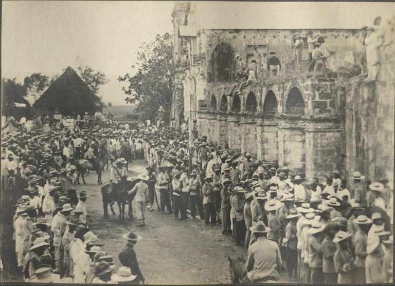 Subject: Filipino soldiers stand in formation at Santa Cruz Church courtyard to surrender as crowds look on. General Cailles surrendered with 600 of his men and 386 rifles on June 24, 1901