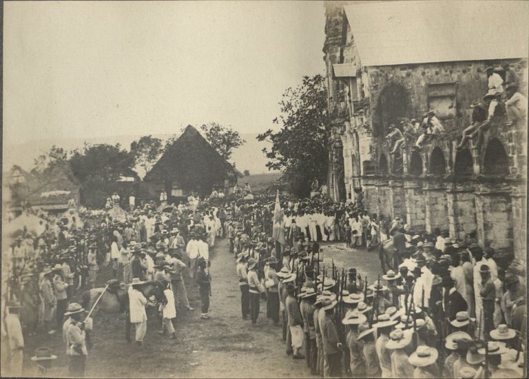 Subject: Filipino soldiers stand in formation and present arms at Santa Cruz Church courtyard to surrender as crowds look on. "Old Glory" is a nickname for the U.S. flag. General Cailles su