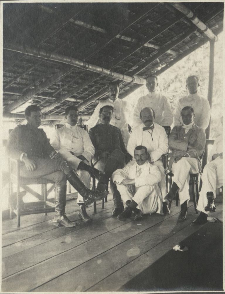 Subject: Ten expatriate men pose for a group portrait under a thatched roof. See also OFI-002432 for a virtually identical image. Arlington Ulysses Betts served as Governor of Albay Province from 1902