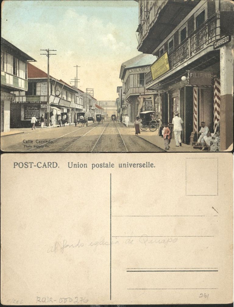 Subject: Carriedo Street in Santa Cruz (�behind Quiapo church�) with streetcar tracks and calesas.