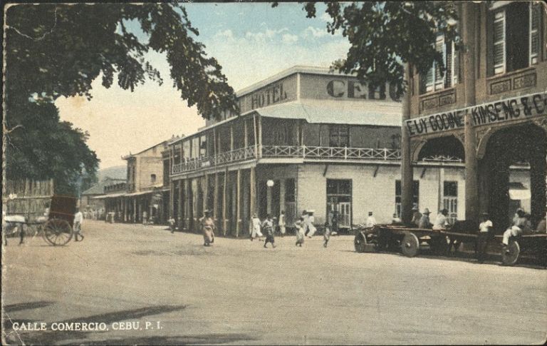 Subject: Wide intersection of commercial street in Cebu City facing Cebu Hotel and pedestrians.