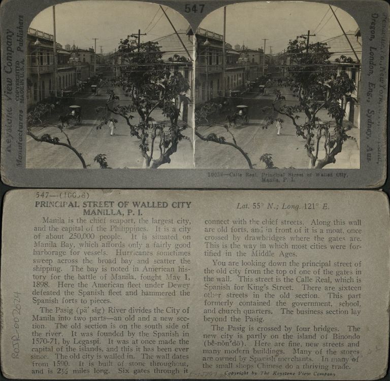 Keystone #K10058-I. View of Calle Real in old walled city of Intramuros, taken from on top of one of the gates through the city walls.