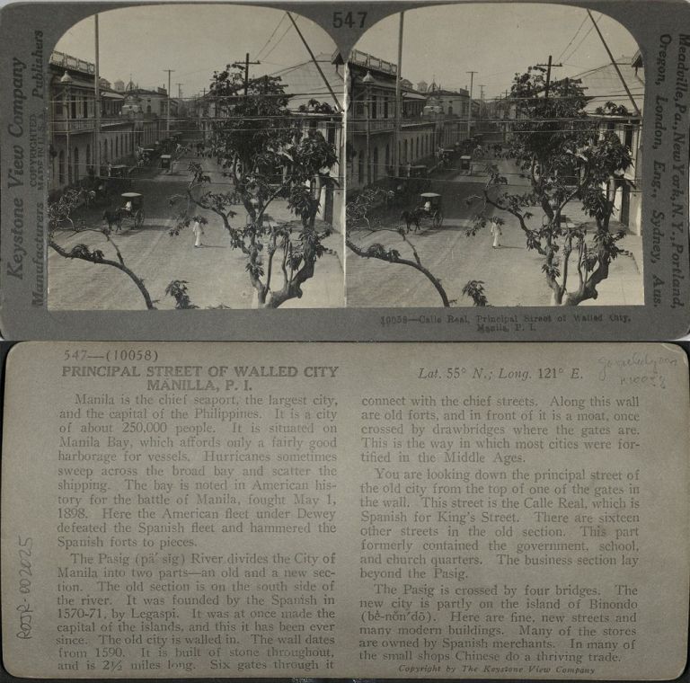 Keystone #K10058-I. View of Calle Real in old walled city of Intramuros, taken from on top of one of the gates through the city walls.