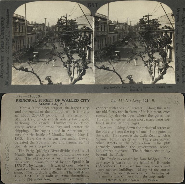 Keystone #K10058-I. View of Calle Real in old walled city of Intramuros, taken from on top of one of the gates through the city walls.