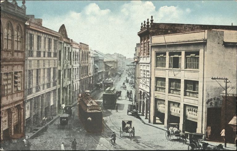 Subject: Busy Manila commercial district along Rosario Street with streetcars and calesas.