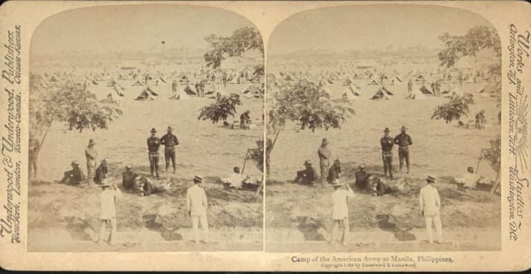 Underwood #U750a. Army camp, tents, and soldiers in big field near Manila, Philippines.