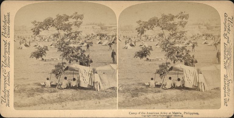 Underwood #U750b. Army camp, tents, and soldiers in big field near Manila, Philippines.