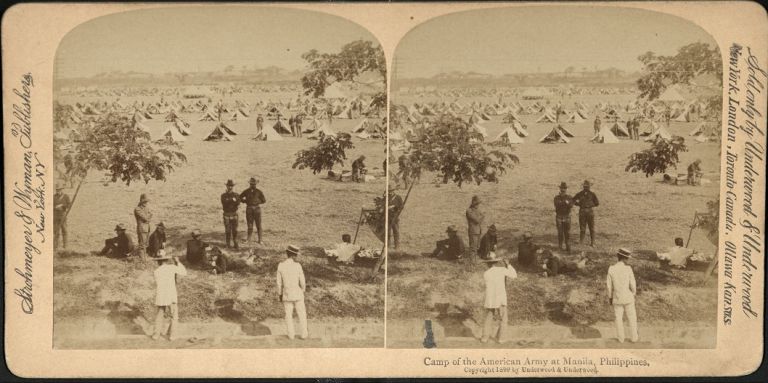 Underwood #U750a. Army camp, tents, and soldiers in big field near Manila, Philippines.