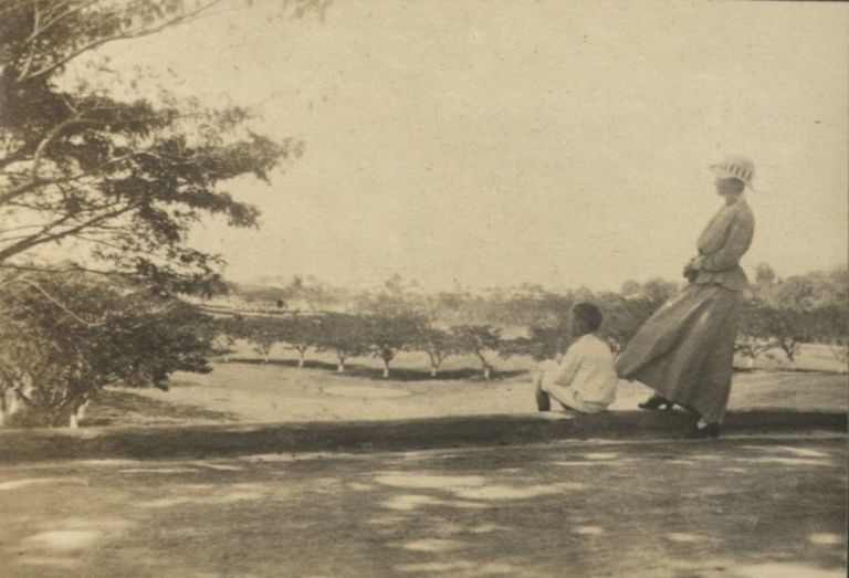 Subject: Likely that is Elizabeth Tower Baird looking out at ornamental trees (Flame trees?) on the grounds of Camp Eldridge in Los Banos, Laguna Province. Originally a U.S. Army facility, Camp Eldrid