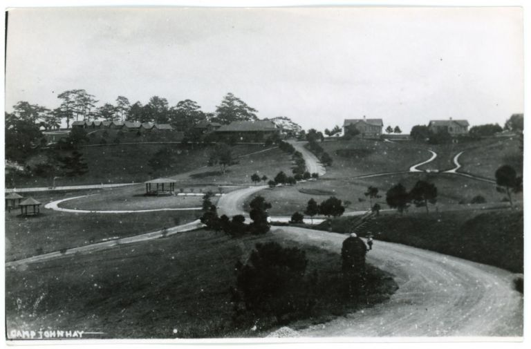 Winding roads and paths in Camp John Hay, Baguio. Buildings on ridgeline (possibly officer's quarters, see ROJR-000064). A circa-1950s print of an earlier image.