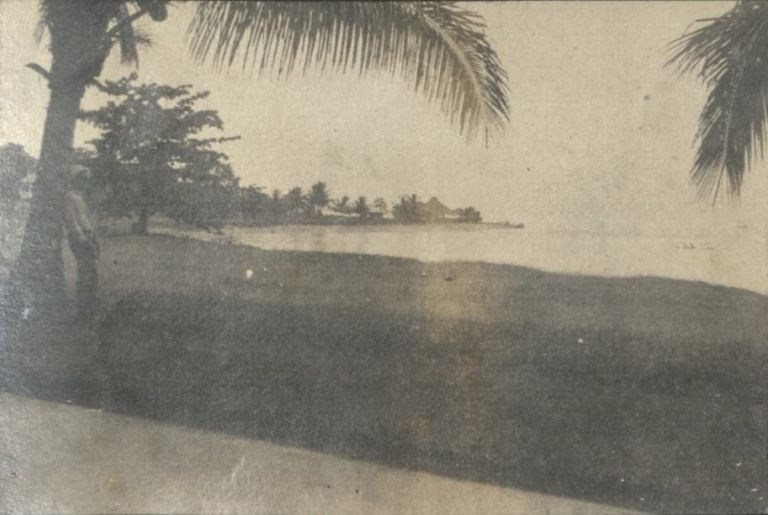 Subject: Beach and seashore with officer's club building on a promontory near sea. Camp Overton was a U.S. Army camp near Iligan City in northern Mindanao. See also OFI-000392 for a very similar view.