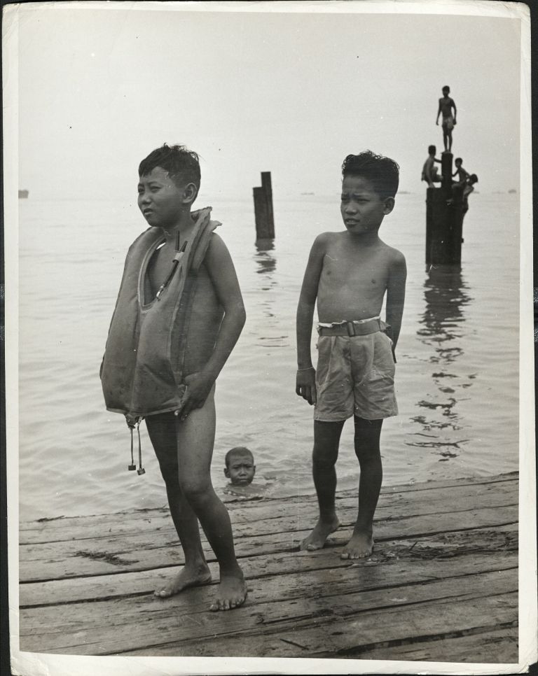 Subject: A naked Filipino boy wearing a life jacket stands next to another boy on a dock (in Manila Bay?) while their buddies stand on top of a wooden piling in the sea. See also OFI-001503 for a simi