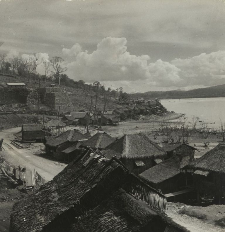 A village or worker's houses line a road along a bay or river. The dead trees and barren hillside are reminiscent of the smelting photos (OFI-001221 and OFI-001090).