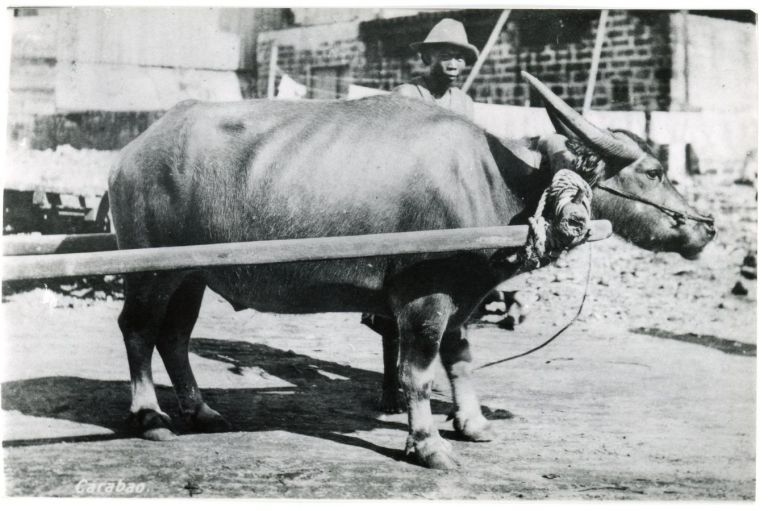 Filipino man stands behind a carabao yoked to a cart in the street.