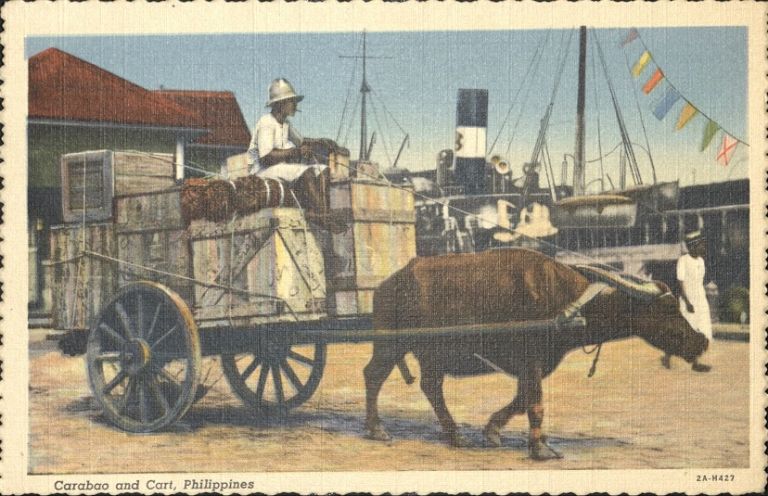 Subject: Carabao pulls man atop fully-loaded cart on a wharf in the Philippines; steamship moored in background.