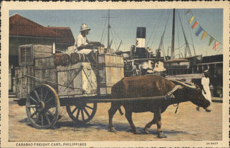 Subject: Carabao pulls man atop fully-loaded cart on a wharf in the Philippines; steamship moored in background.