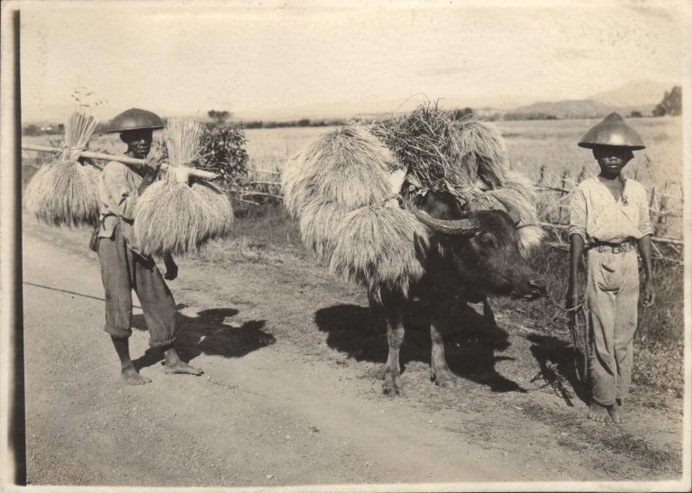 Subject: Two Filipinos and a carabao carry harvested rice stalks from the field along a road. The handwriiten caption below this photo calls it "hemp," but this is clearly not abaca. It appears to be