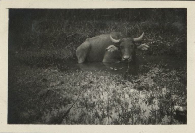 Subject: A carabao cooling off in a mud hole in a field, probably in Albay Province where Harry Jr. was visiting. The carabao has no pores in his skin, consequently he doesn't sweat. The frequent imm
