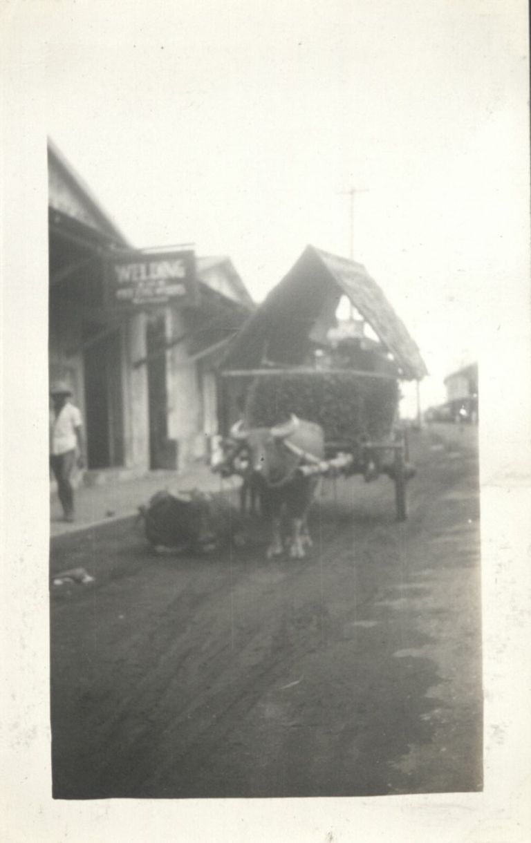 Subject: Team of two carabaos hitched to a covered cart next to a welding shop in Legaspi City. The cart appears to carry poles or perhaps cane stalks.
