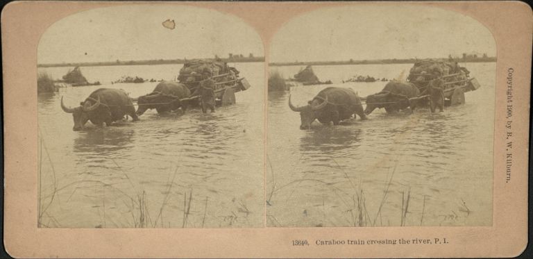 Cariboo [caribao] train crossing the river, P. I.