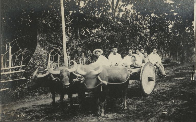 Subject: Typical rural Philippine transportation - a team of carabao pull a cart full of Filipinos down a muddy road. The people are all well dressed - perhaps they are going to church or an event.
