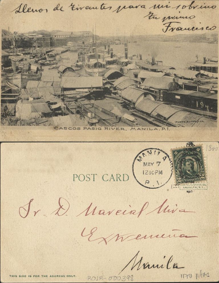 Subject: Freight boats (cascos) and steamships tied up along Pasig River.