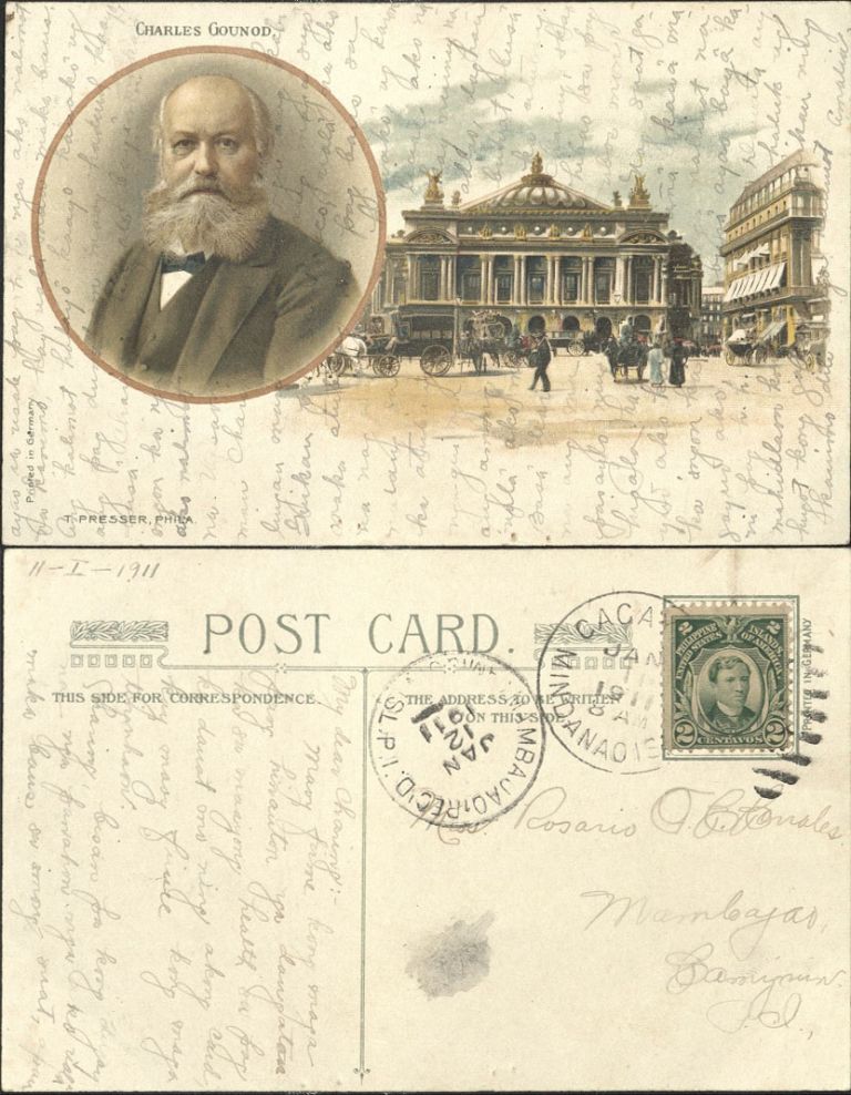 Subject: Portrait of the French composer and view across plaza at magnificent, ornate building. He is particularly noted for his operas, of which the most famous is Faust.