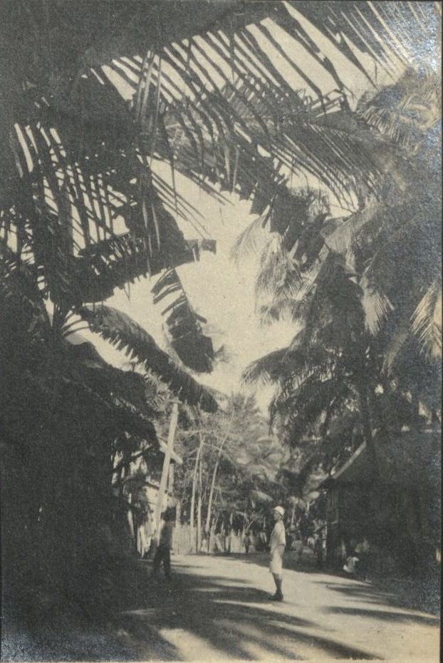 Subject: Charles in the distance standing on a narrow, palm-lines road in a village in Molo. Molo was a separate town before it was merged into Iloilo City in 1937. It was originally the pari�n of I