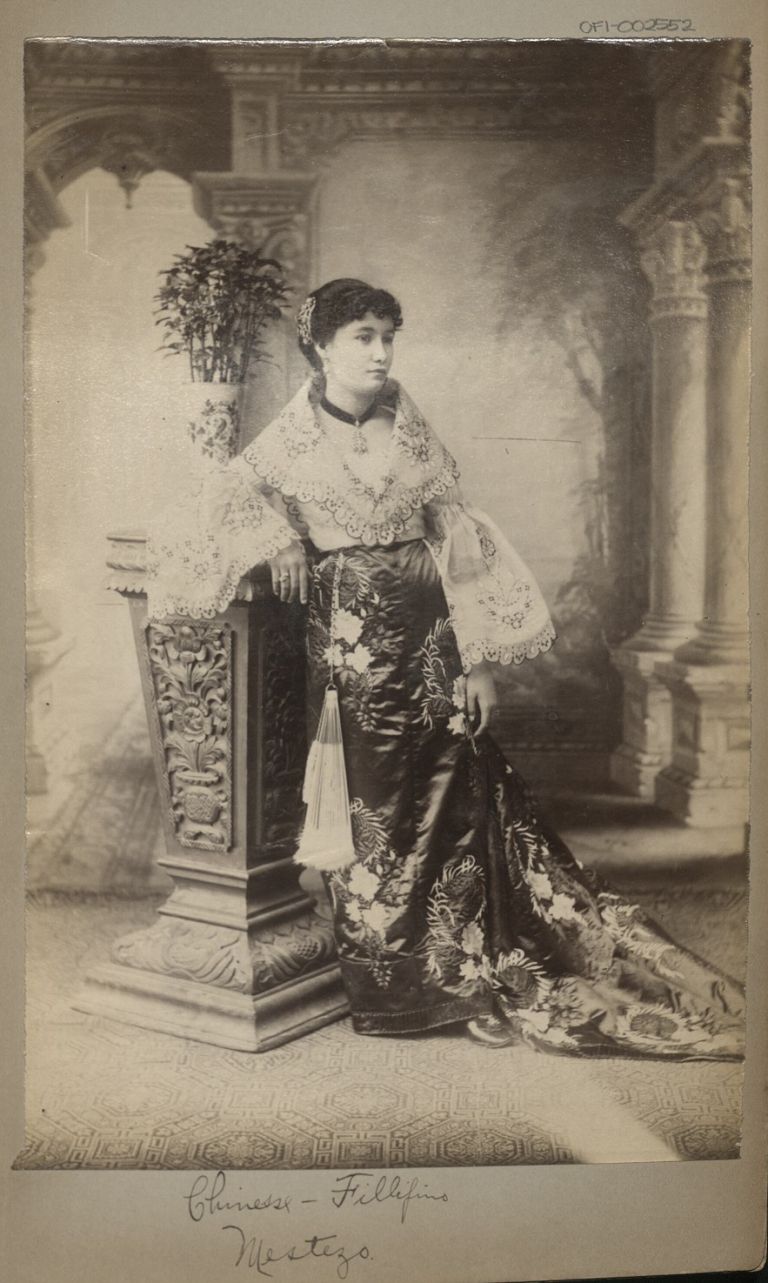 Subject: A Filipina mestiza (allegedly mixed Filipino-Chinese) woman in formal dress poses for a studio portrait in the Philippines. Lieut. Munson M. Z. Guthrie was an officer in Company A, 1st Sou