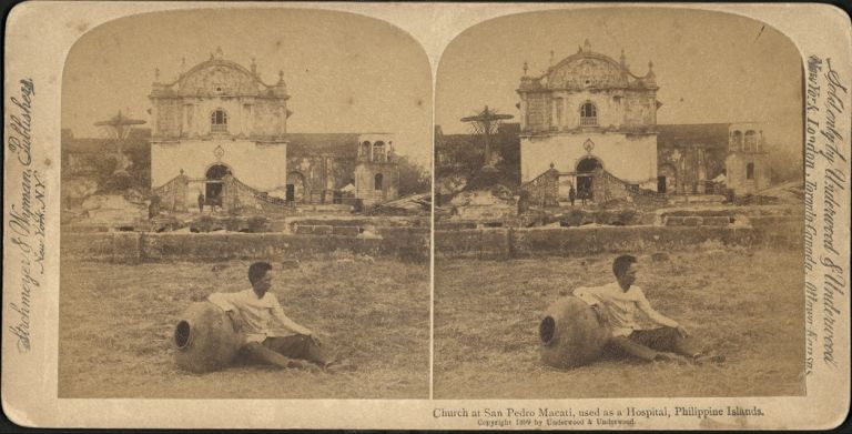 Underwood #U250. Man sitting on grass, resting his arm on an urn, in front of a church. San Pedro Macati is the former name (including its patron saint) of present-day Makati.