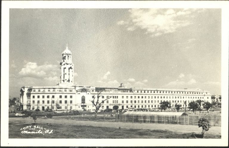Subject: Manila City Hall, rebuilt after World War II, featured uniform windows and a clock tower. It stands at Taft Ave. at Padre Burgos in Ermita. This post-war photo still shows damage to the tower