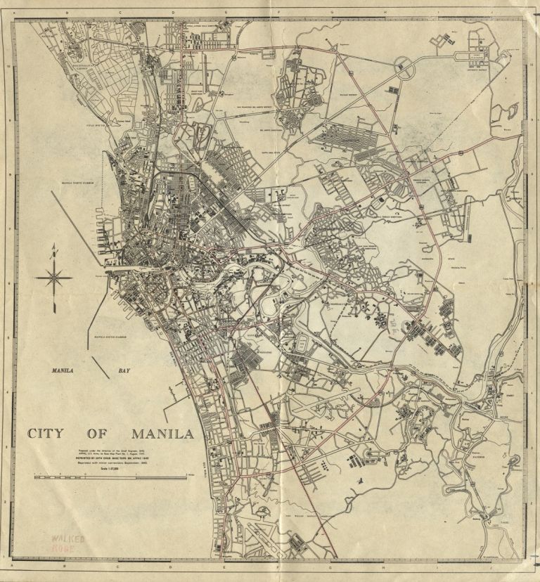 Subject: 1945 U.S. Army map of Manila and surrounding vicinity, with routes marked in red where Mr. Finney walked or rode. What's unusual about this map is it includes areas as far