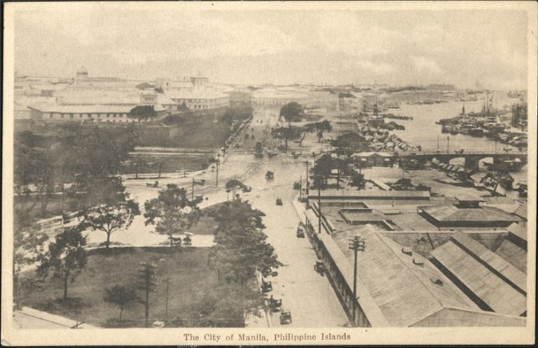 Subject: Aerial view of Manila, Pasig River on right, Intramuros and city walls on left.