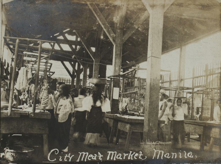 Subject: No doubt that smelled unpleasant - buyers and sellers at an open-air meat market in Manila.