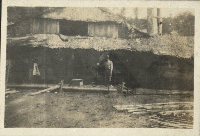 Subject: That's probably Billie (see OFI-004825) standing before a rough-looking nipa structure housing a store in Mindanao.
