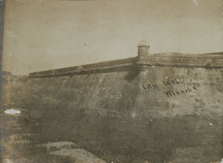Subject: Corner of Intramuros walls and moat with lookout tower, Manila. See also ROJR-000490 for a very similar view.