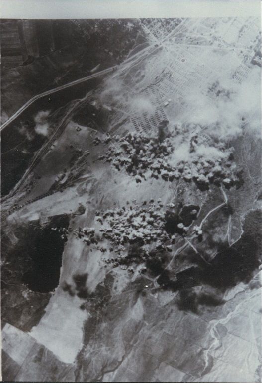 Subject: Aerial view (likely from a Japanese plane) of the Japanese bombing attack on Clark Field in Pampanga, Dec. 8, 1941 - the beginning of WWII hostilities in the Philippines. The surprise attack