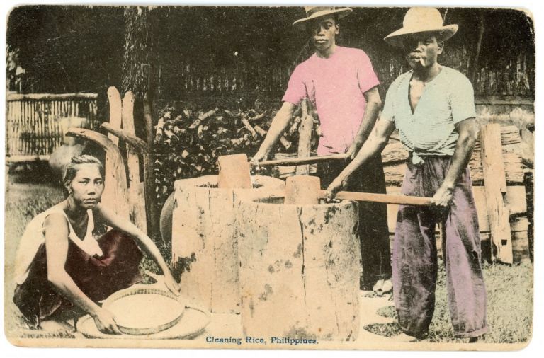 Two men hull rice by pounding it with wooden mallets in a hollowed tree trunk, while a woman cleans the rice in a rice winnower.