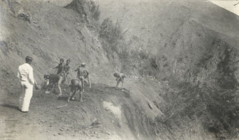 Subject: An American man, immaculate in his white suit, watches Igorot men clearing dirt from a road in the steep mountains of Mountain Province.