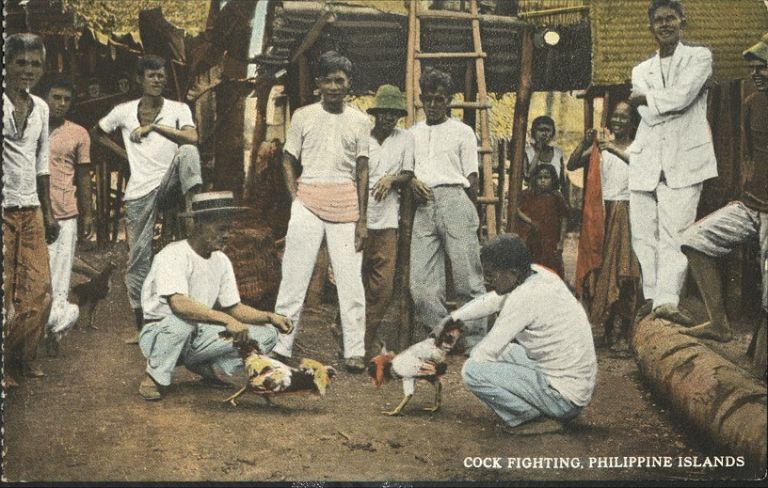 Subject: Group of men in Cebu stand watching two men squatting ready to release their fighting roosters for a cockfight.